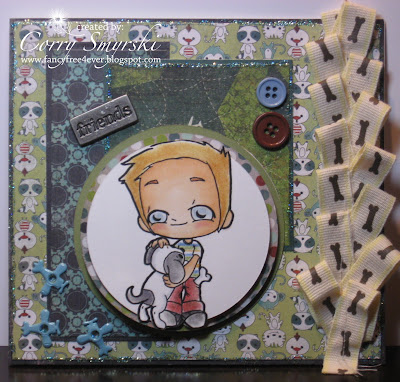I bought this puppy bone ribbon AGES ago & thought it was the perfect accent for my boy card with BG papers. A couple buttons, 'friends' charm & airplane eyelets & we're done!